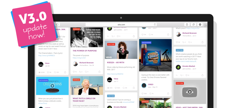 Flow-Flow builds stunning social wall for your WordPress website or blog in a minutes. Unite all of your social feeds with this premium social media stream plugin for WordPress.